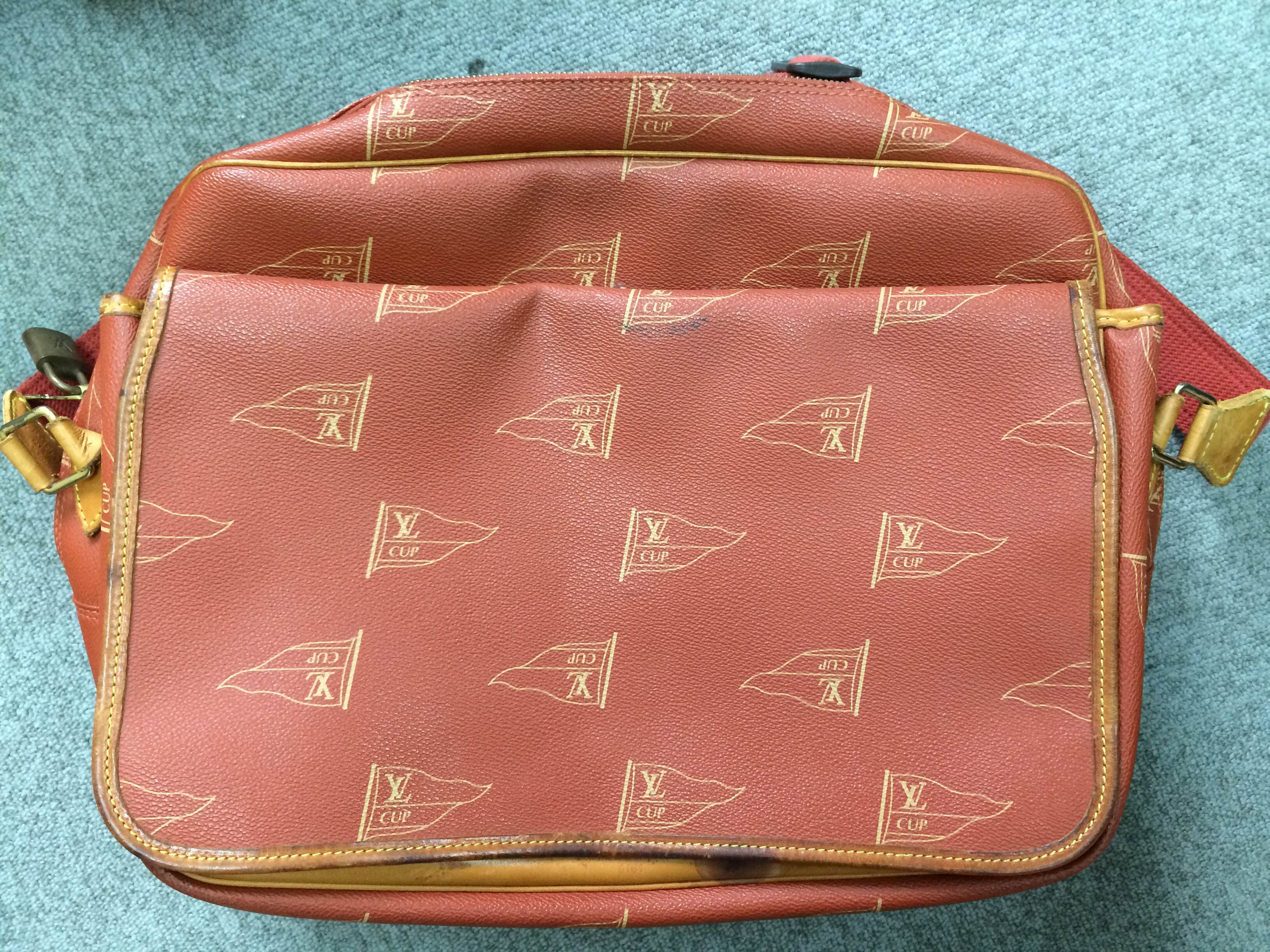 PVCなヴィトンの赤いバッグ、ヴィトンカップと書かれたフラッグデザインのバッグです。